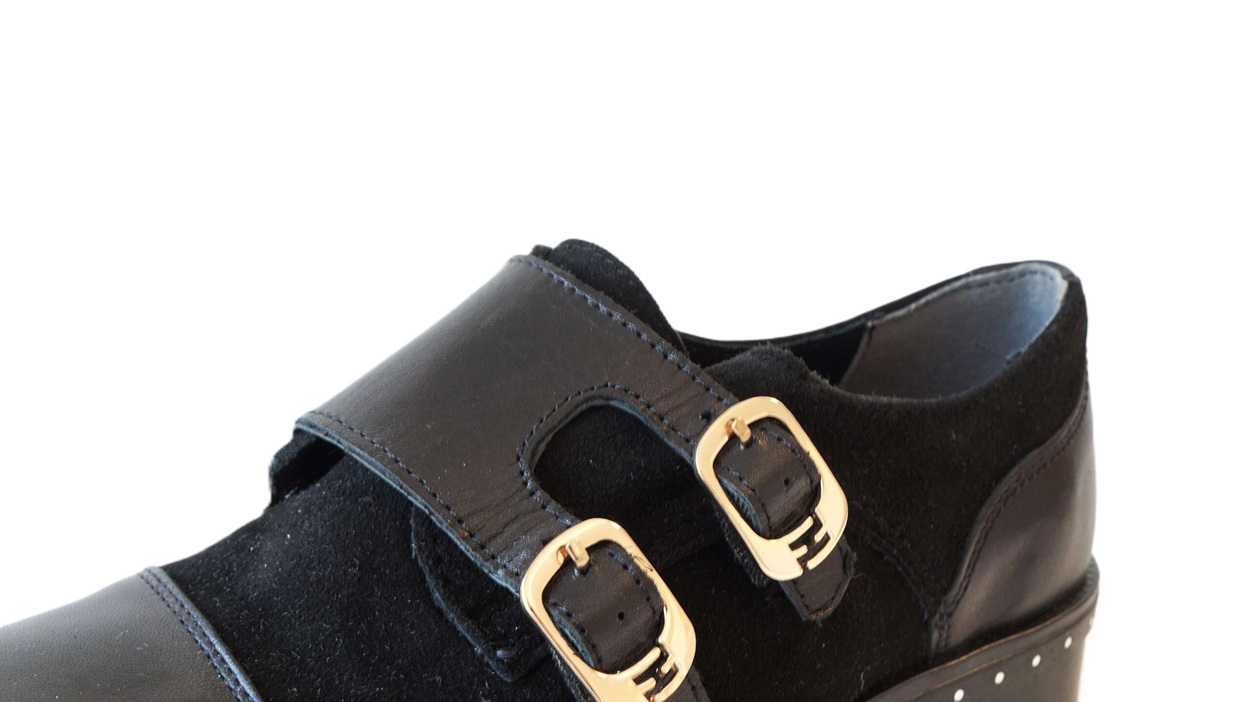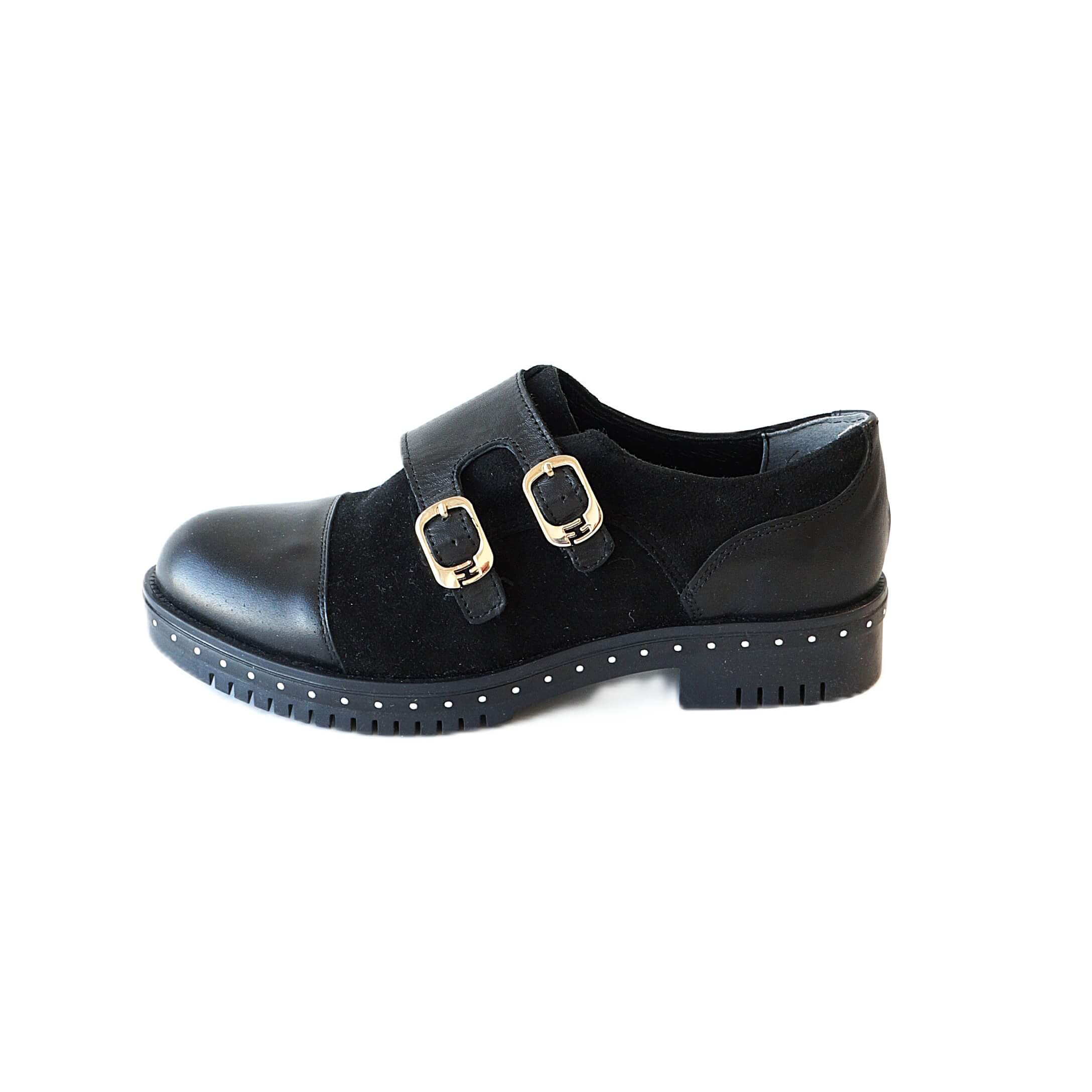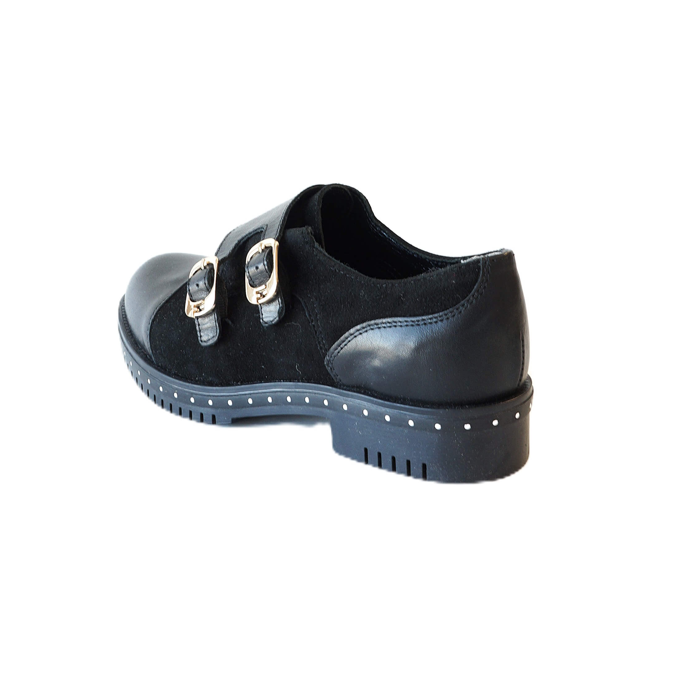 - Išskirtinis dizainas: Dvigubas užsegimas stilingomis sagtimis bei kniedėmis puoštas pado kraštas suteikia batams modernų prieskonį.